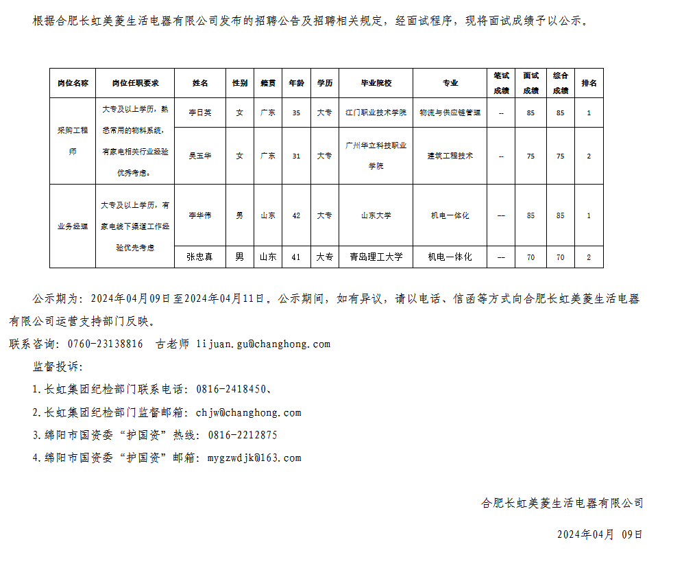 合肥長(zhǎng)虹美菱生活電器有限公司關(guān)于招聘采購(gòu)工程師等崗位測(cè)試成績(jī)的公示