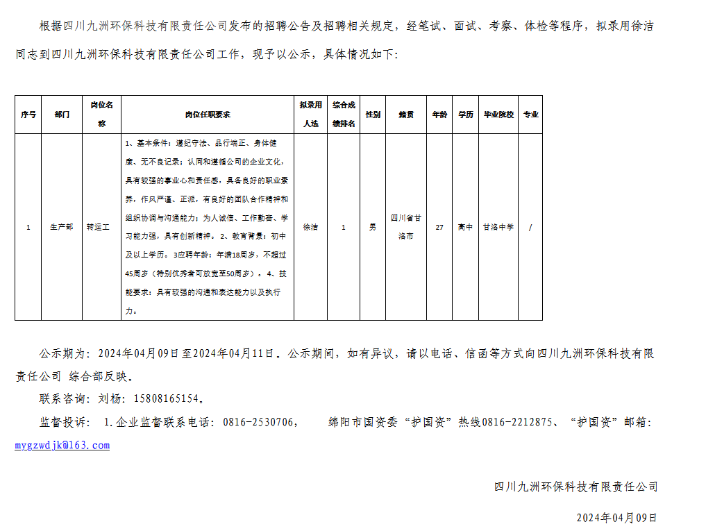 四川九洲環(huán)??萍加邢挢?zé)任公司關(guān)于招聘轉(zhuǎn)運(yùn)工崗位擬錄用人員的公示