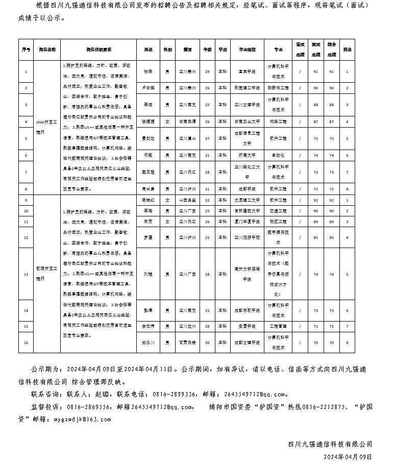 四川九強(qiáng)通信科技有限公司關(guān)于招聘JAVA開(kāi)發(fā)工程師等崗位測(cè)試成績(jī)的公示