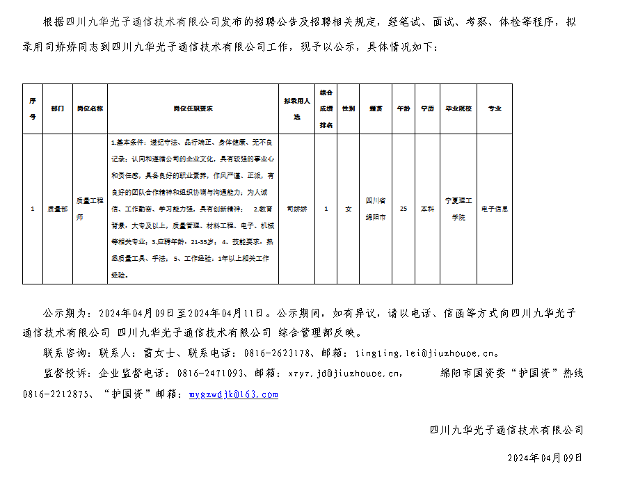 四川九華光子通信技術(shù)有限公司關(guān)于招聘質(zhì)量工程師擬錄用人員的公示