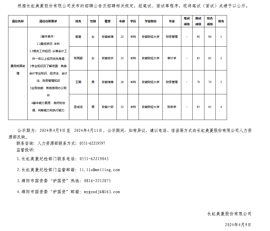 長虹美菱股份有限公司關于招聘費用核算助理測試成績的公示