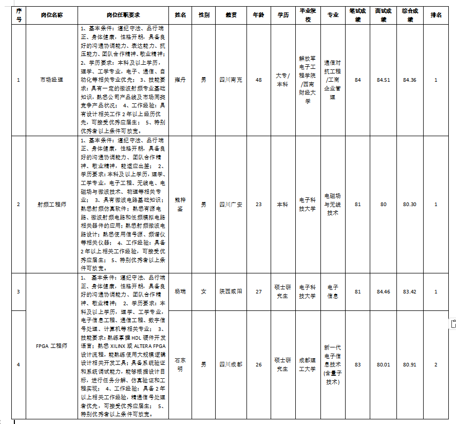 根據(jù)成都九州迪飛科技有限責任公司發(fā)布的招聘公告及招聘相關(guān)規(guī)定,經(jīng)筆試、面試等程序,現(xiàn)將筆試(面試)成績予以公示。