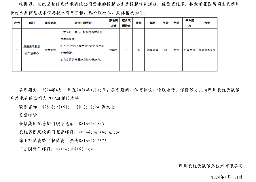四川長(zhǎng)虹云數(shù)信息技術(shù)有限公司關(guān)于招聘銷售經(jīng)理崗位擬錄用人員的公示