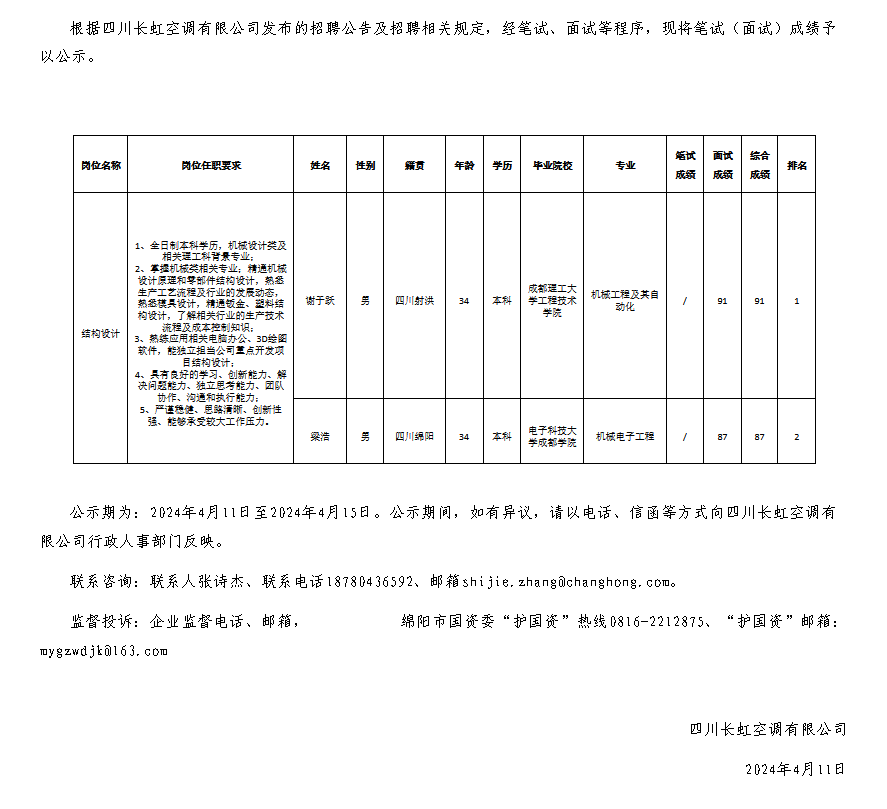 四川長虹空調(diào)有限公司關(guān)于招聘結(jié)構(gòu)設(shè)計崗位測試成績的公示