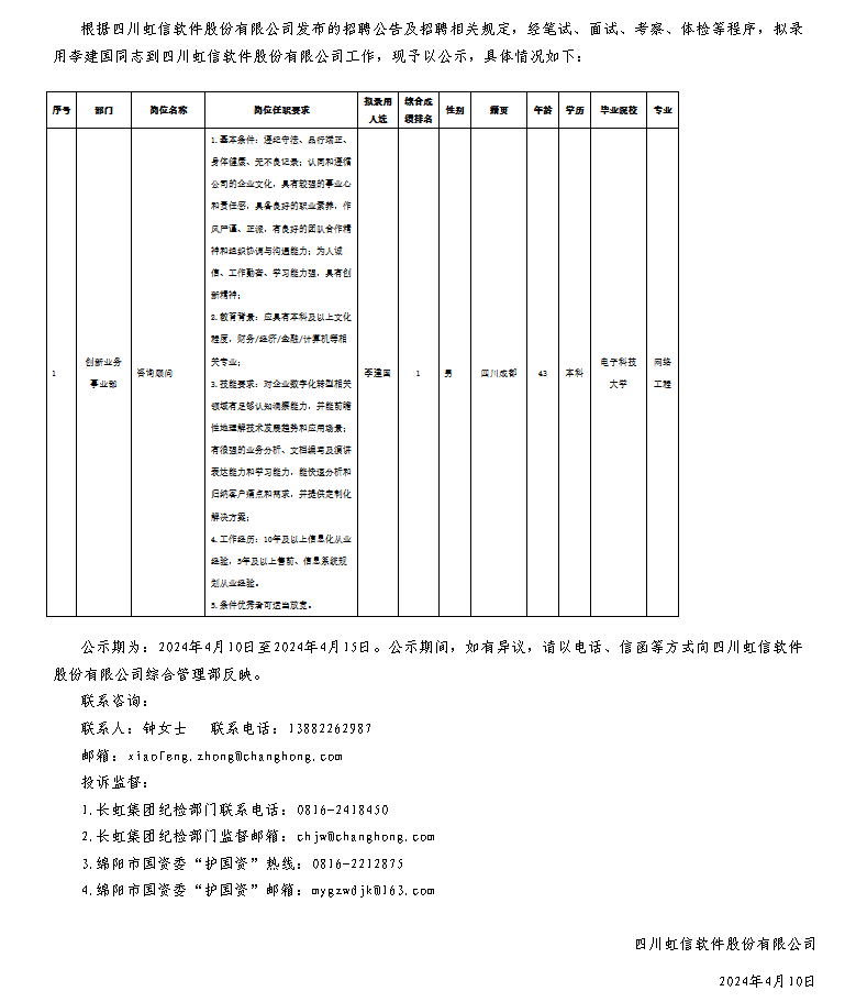 四川虹信軟件股份有限公司關(guān)于招聘咨詢顧問崗位擬錄用人員的公示