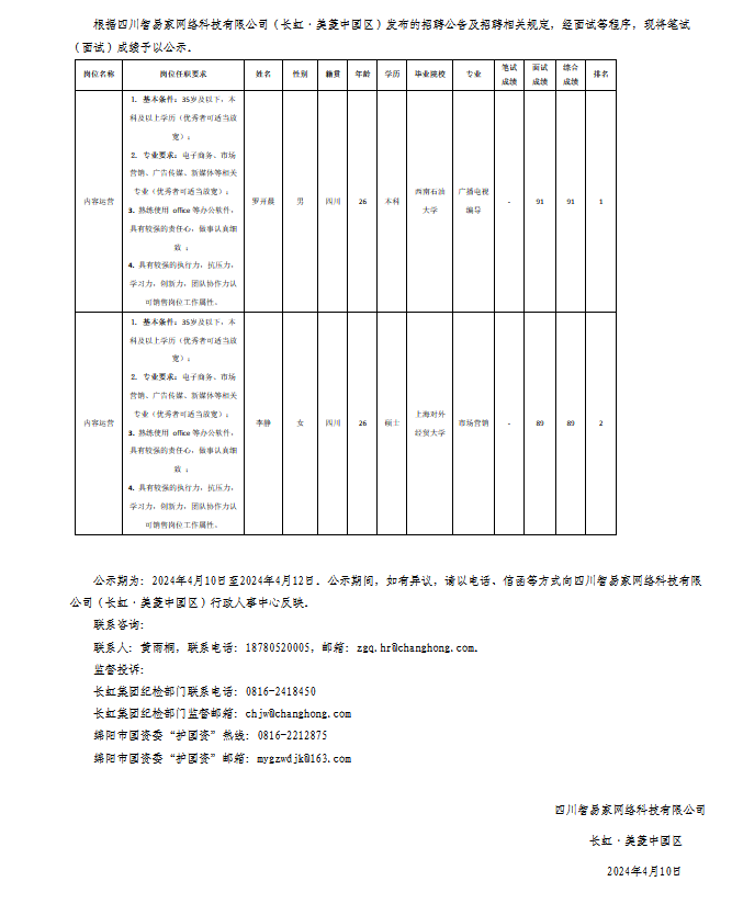 四川智易家網(wǎng)絡(luò)科技有限公司關(guān)于招聘內(nèi)容運(yùn)營(yíng)崗位測(cè)試成績(jī)的公示