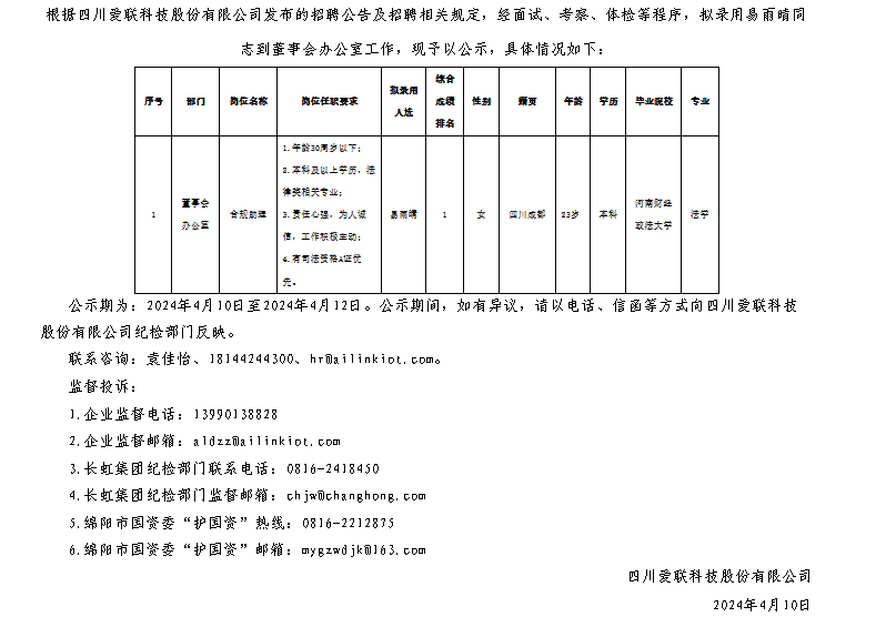 四川愛聯(lián)科技股份有限公司關(guān)于招聘合規(guī)助理崗位擬錄用人員的公示