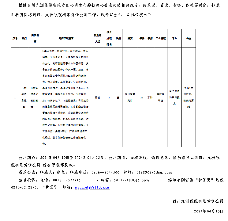 四川九洲線纜有限責(zé)任公司關(guān)于招聘技術(shù)與信息化部副部長擬錄用人員的公示