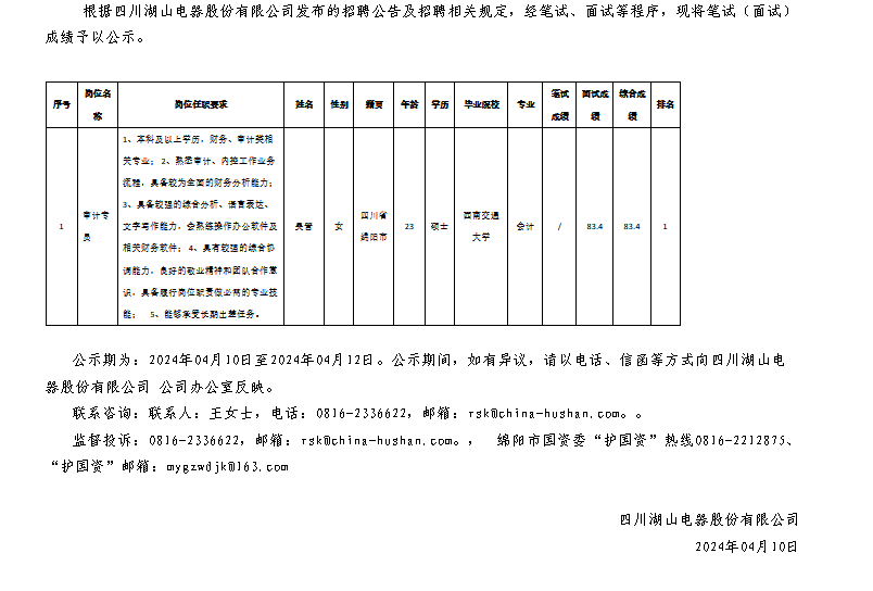 四川湖山電器股份有限公司關(guān)于招聘審計專員測試成績的公示