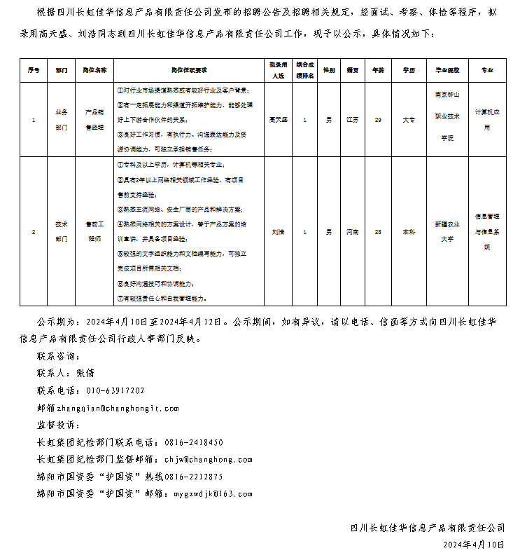 四川長虹佳華信息產(chǎn)品有限責任公司關(guān)于招聘產(chǎn)品銷售經(jīng)理等崗位擬錄用人員的公示