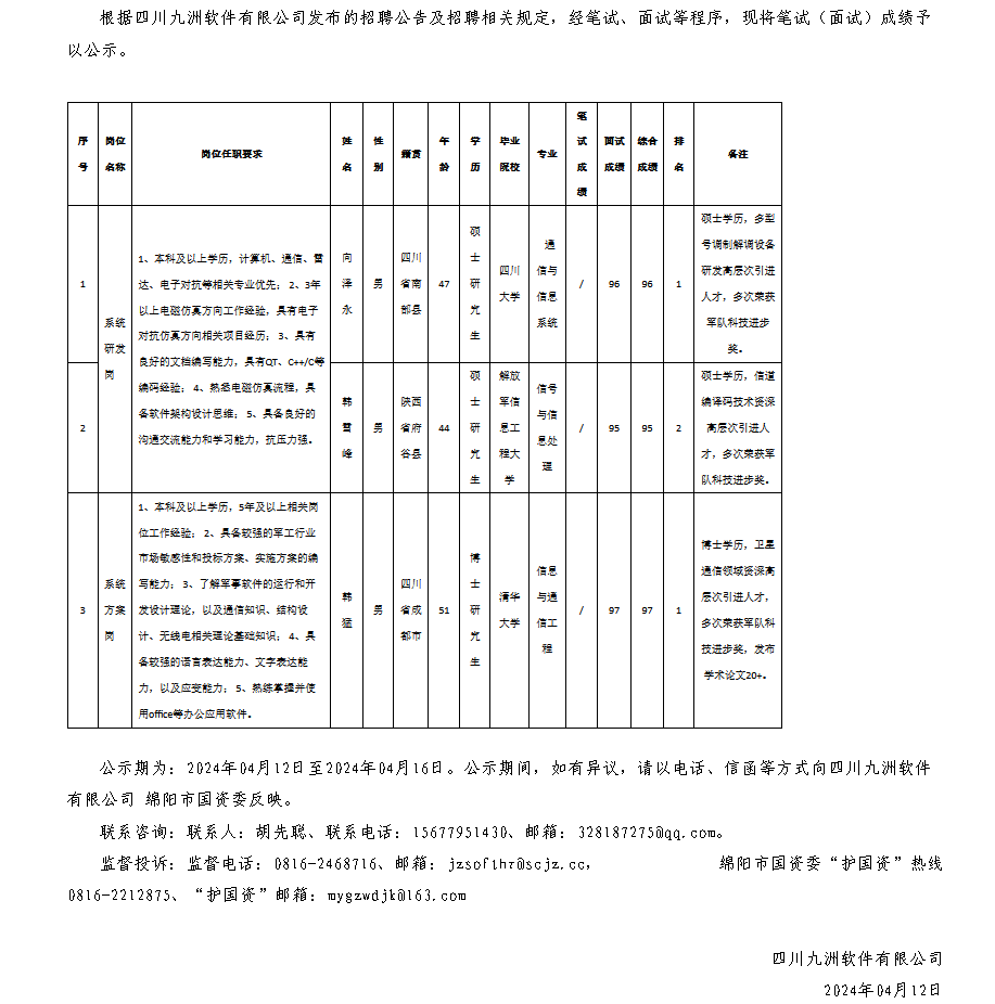四川九洲軟件有限公司關(guān)于招聘系統(tǒng)方案等崗位測試成績的公示