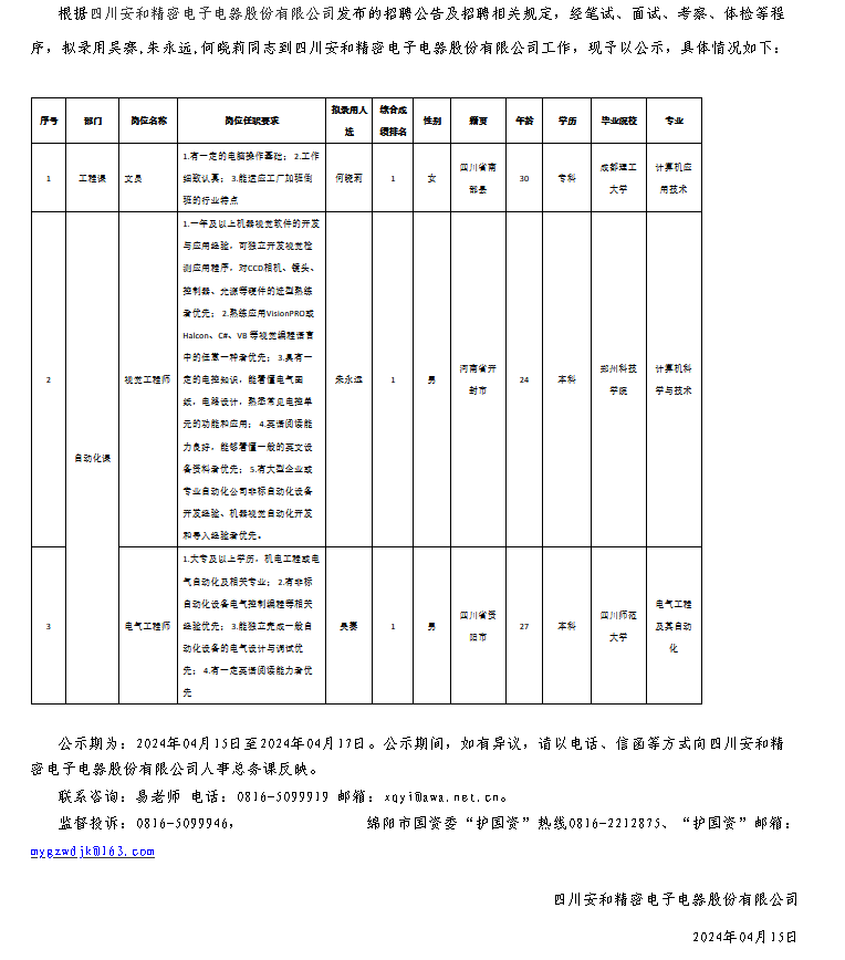 四川安和精密電子電器股份有限公司關(guān)于招聘自動(dòng)化工程師等崗位擬錄用人員的公示