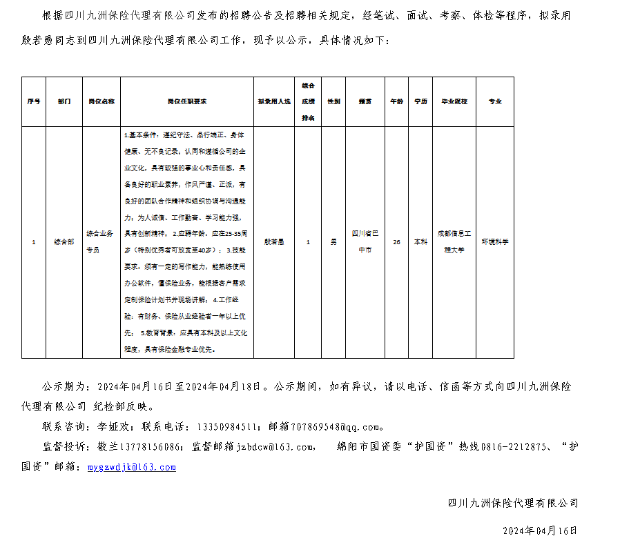 四川九洲保險(xiǎn)代理有限公司關(guān)于招聘綜合業(yè)務(wù)專員擬錄用人員的公示