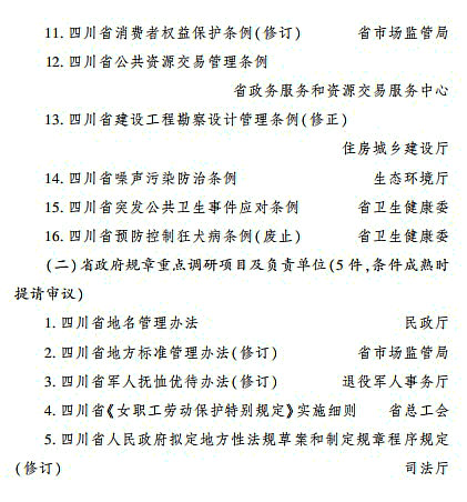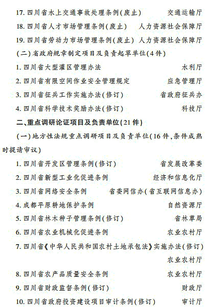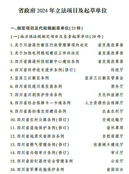 日前,省政府辦公廳印發(fā)《四川省人民政府2024年立法計(jì)劃》。省政府2024年立法計(jì)劃項(xiàng)目共44件,其中制定類項(xiàng)目23件(地方性法規(guī)19件、省政府規(guī)章4件),重點(diǎn)調(diào)研論證類項(xiàng)目21件(地方性法規(guī)16件、省政府規(guī)章5件)。