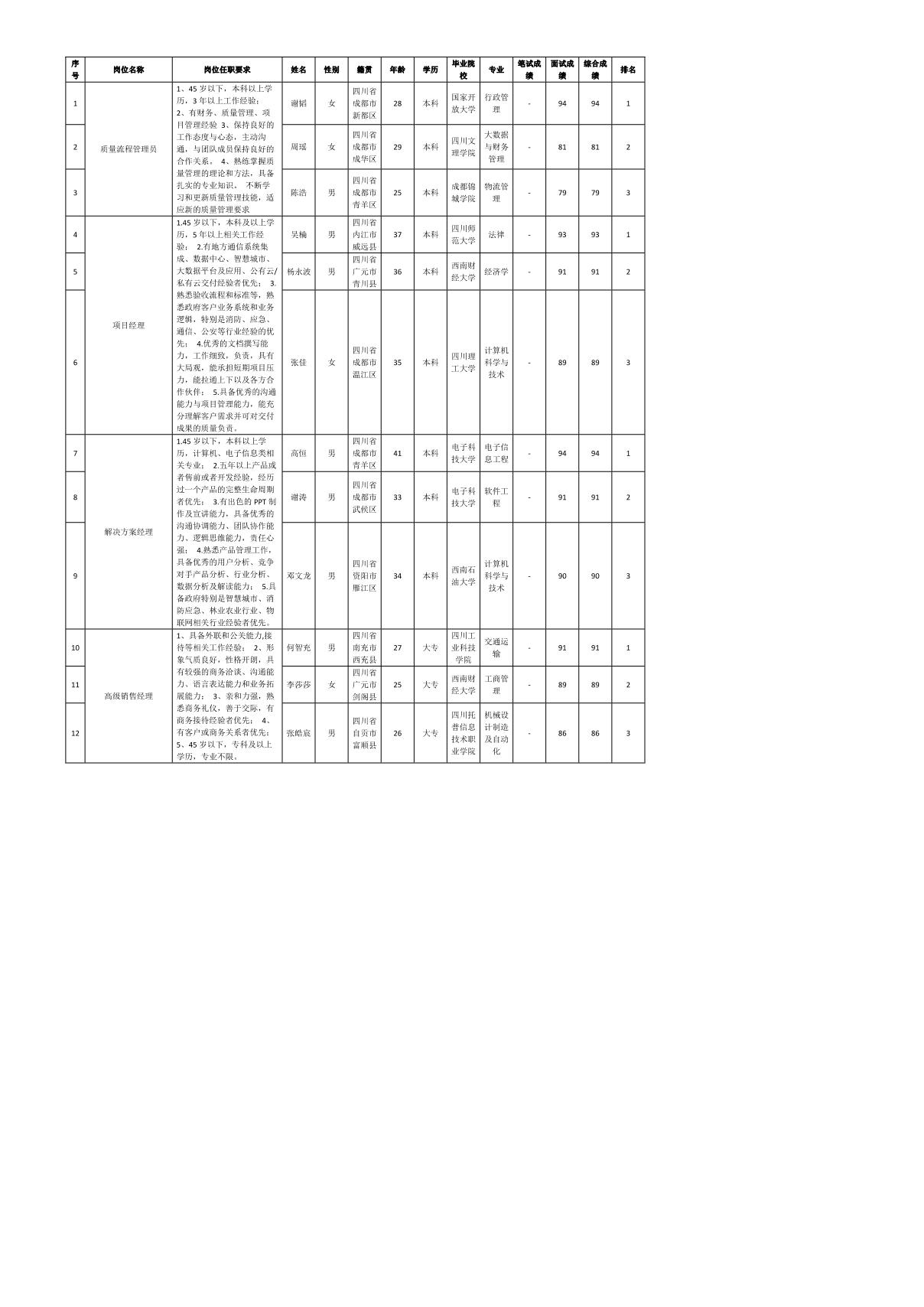 根據(jù)成都衛(wèi)通信息技術(shù)有限公司發(fā)布的招聘公告及招聘相關(guān)規(guī)定,經(jīng)筆試、面試等程序,現(xiàn)將筆試(面試)成績予以公示。