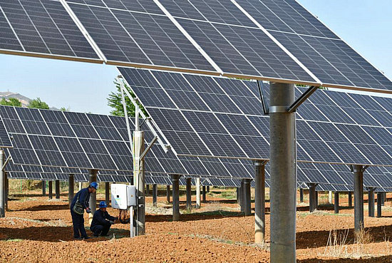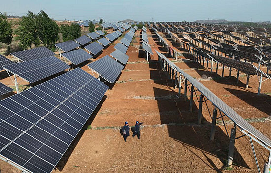 4月16日,工人在河北省石家莊市靈壽縣譚莊鄉(xiāng)程家莊村的“農(nóng)光互補(bǔ)”光伏發(fā)電場(chǎng)檢查輸電設(shè)備。