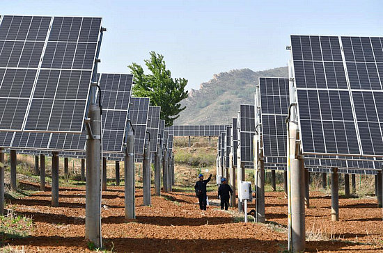 4月16日,工人在河北省石家莊市靈壽縣譚莊鄉(xiāng)程家莊村的“農(nóng)光互補(bǔ)”光伏發(fā)電場(chǎng)巡查。