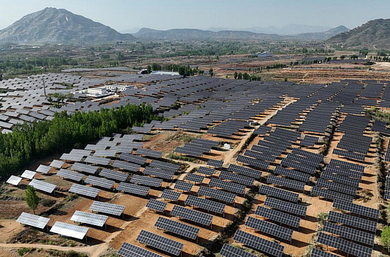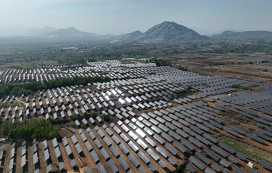 4月16日拍攝的河北省石家莊市靈壽縣譚莊鄉(xiāng)程家莊村的“農(nóng)光互補(bǔ)”光伏發(fā)電場(chǎng)(無(wú)人機(jī)照片)。