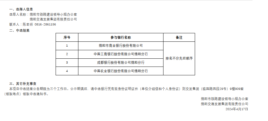 綿遂內(nèi)鐵路綿陽段市級資金存放銀行競爭性方式選擇項目中選結(jié)果公告