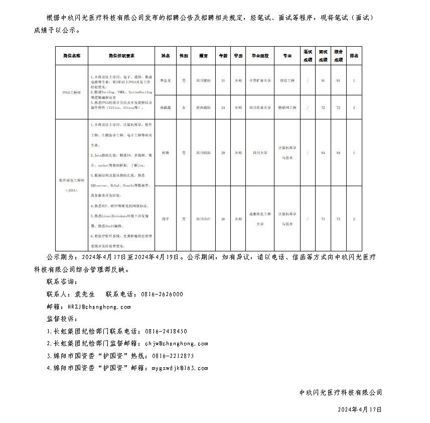 中玖閃光醫(yī)療科技有限公司關(guān)于招聘FPGA工程師等崗位測(cè)試成績(jī)的公示