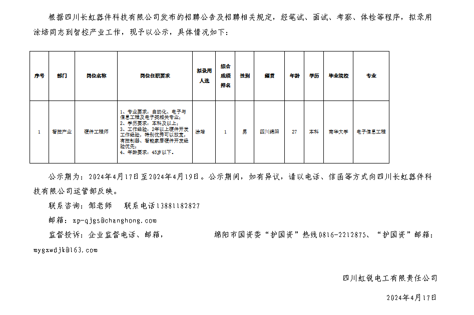 四川長虹器件科技有限公司關(guān)于招聘硬件工程師崗位擬錄用人員的公示