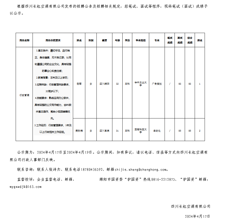 四川長虹空調(diào)有限公司關(guān)于招聘行政管理崗位測試成績的公示