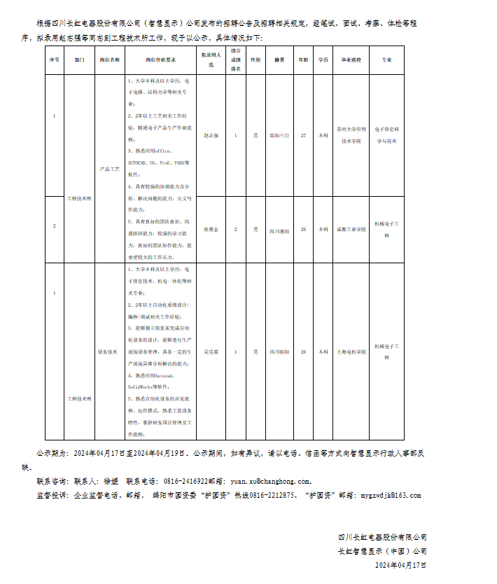 四川長(zhǎng)虹電器股份有限公司(智慧顯示)關(guān)于招聘產(chǎn)品工藝等崗位擬錄用人員的公示