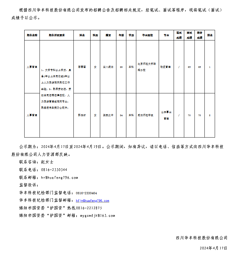 四川華豐科技股份有限公司關(guān)于招聘人事管理測(cè)試成績(jī)的公示