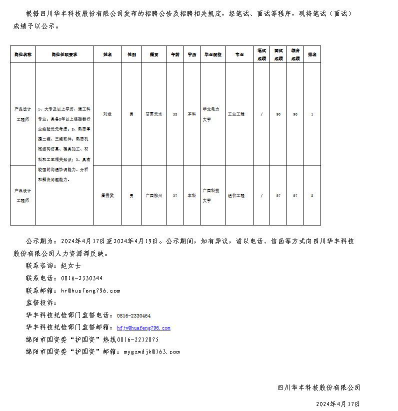 四川華豐科技股份有限公司關(guān)于招聘產(chǎn)品設(shè)計(jì)工程師崗位測試成績的公示
