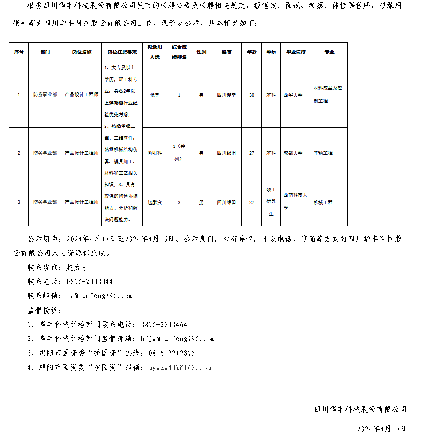 四川華豐科技股份有限公司關(guān)于招聘產(chǎn)品設(shè)計(jì)工程師擬錄用人員的公示