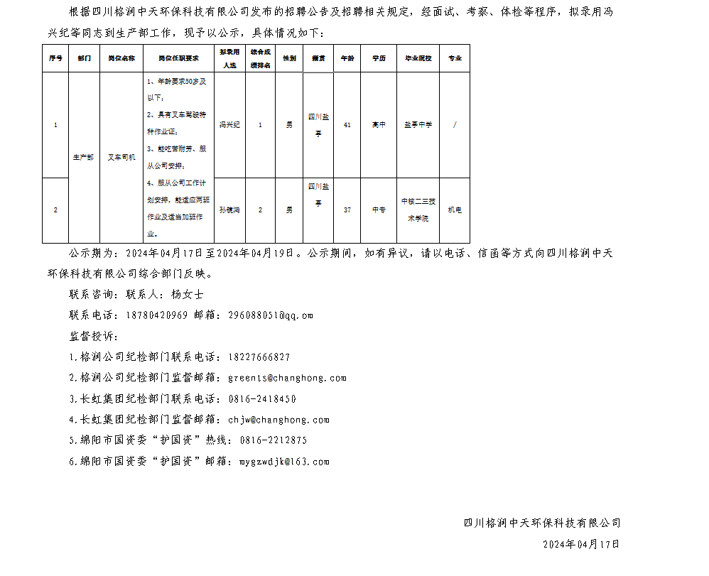 四川格潤中天環(huán)??萍加邢薰娟P(guān)于招聘叉車司機崗位擬錄用人員公示