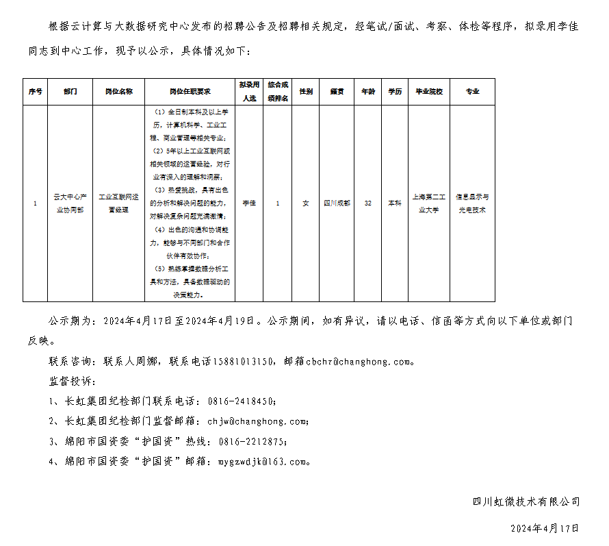 四川虹微技術(shù)有限公司關(guān)于招聘工業(yè)互聯(lián)網(wǎng)運(yùn)營(yíng)經(jīng)理崗位擬錄用人員的公示