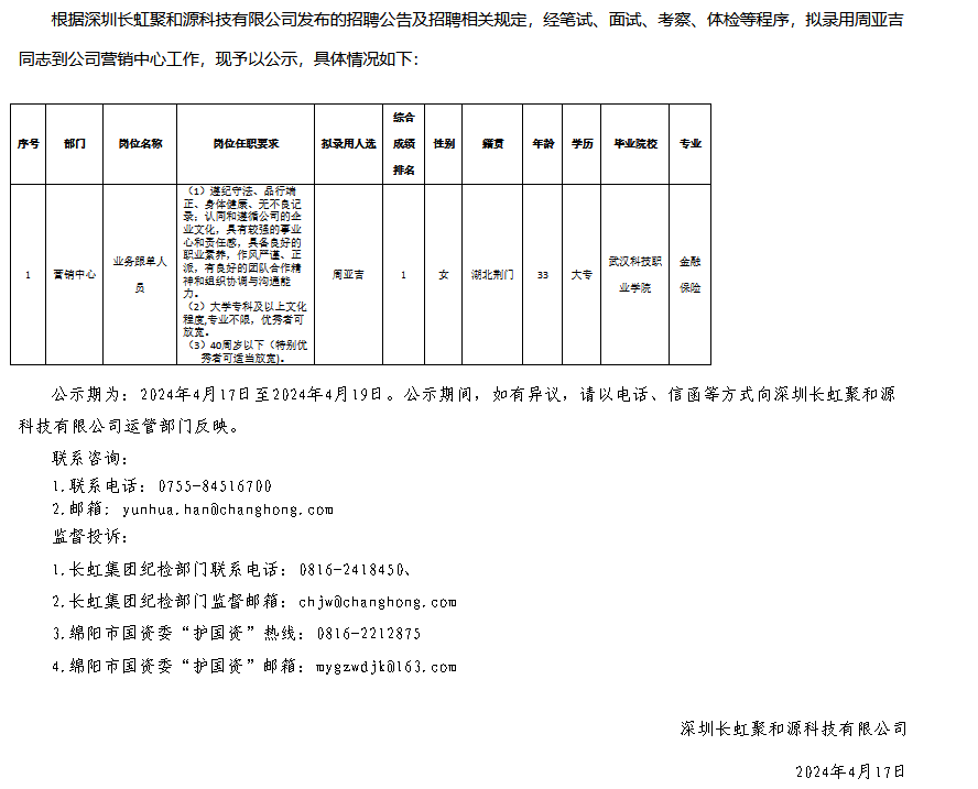 深圳長虹聚和源科技有限公司關(guān)于招聘業(yè)務(wù)跟單人員擬錄用人員的公示