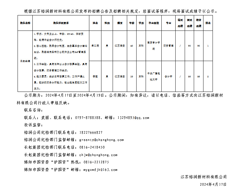 江蘇格潤(rùn)新材料有限公司關(guān)于招聘總賬經(jīng)理崗位測(cè)試成績(jī)的公示