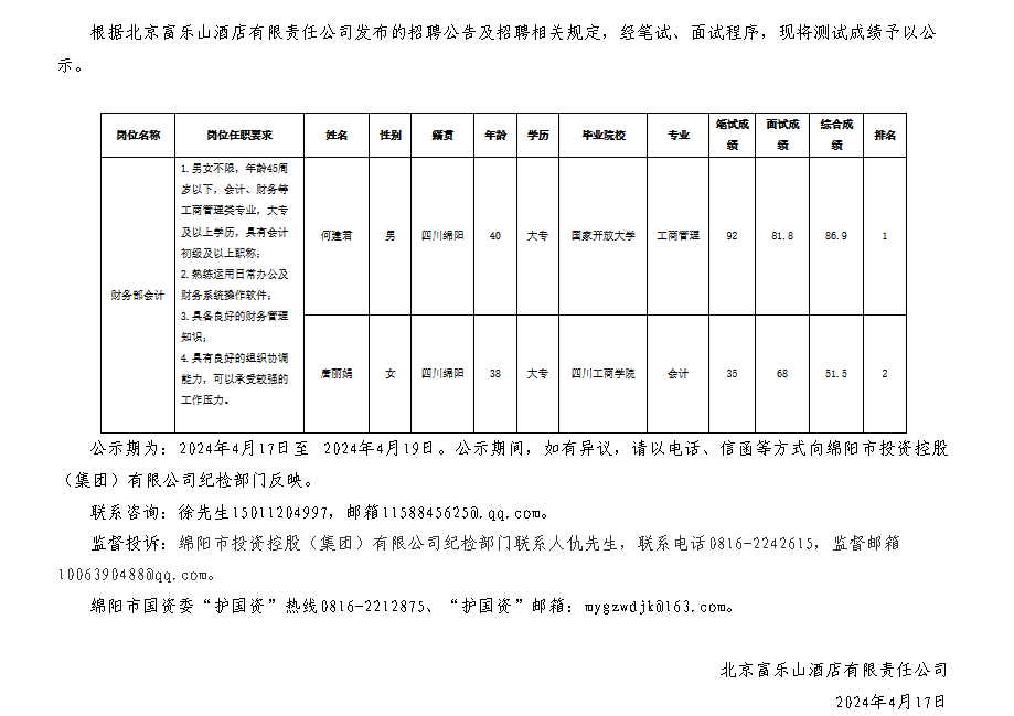 北京富樂山酒店有限責(zé)任公司關(guān)于招聘財務(wù)會計崗位測試成績的公示