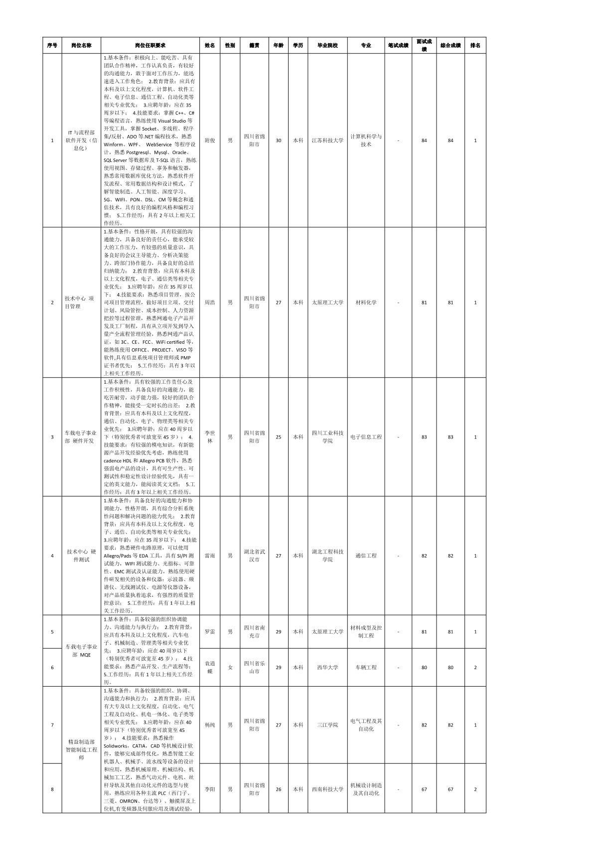 根據(jù)四川九州電子科技股份有限公司發(fā)布的招聘公告及招聘相關(guān)規(guī)定,經(jīng)筆試、面試等程序,現(xiàn)將筆試(面試)成績予以公示。