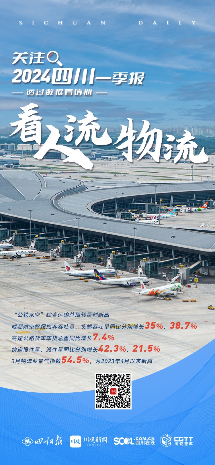 不僅僅是航空。數(shù)據(jù)顯示,今年一季度,四川交通運(yùn)輸、倉儲(chǔ)和郵政業(yè)增長10.1%,3月物流業(yè)景氣指數(shù)54.5%,為2023年4月以來新高。