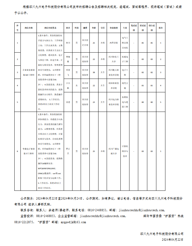 四川九州電子科技股份有限公司關于招聘IT工程師等崗位測試成績的公示