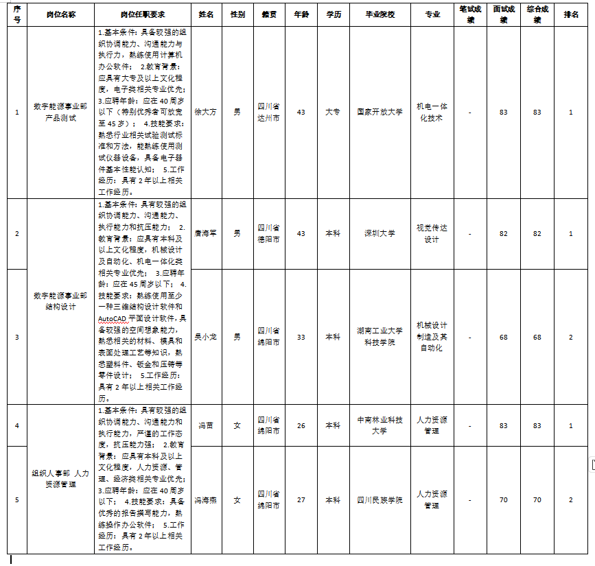 根據(jù)四川九州電子科技股份有限公司發(fā)布的招聘公告及招聘相關規(guī)定,經筆試、面試等程序,現(xiàn)將筆試(面試)成績予以公示。
