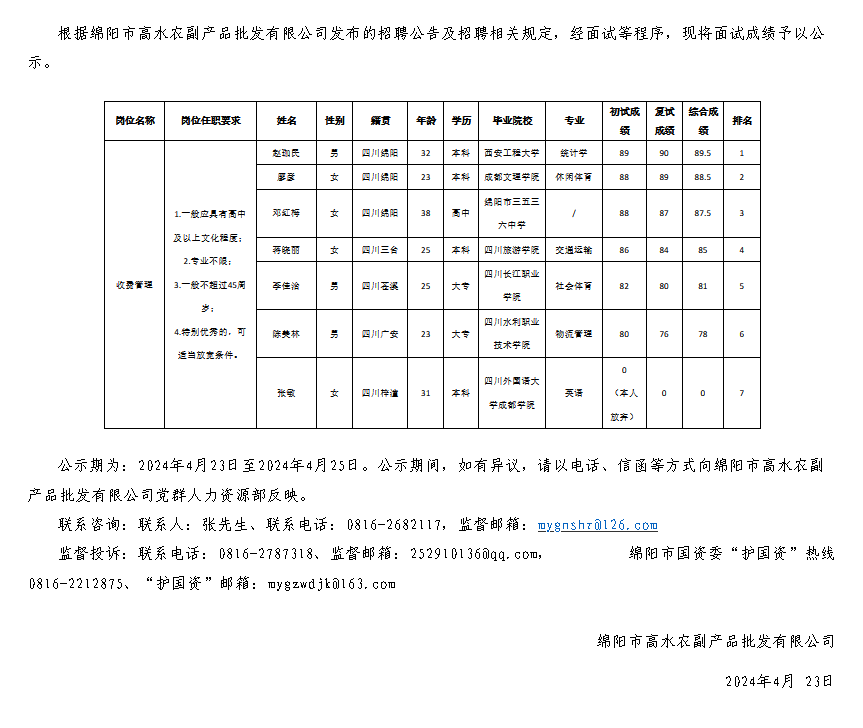 綿陽市高水農(nóng)副產(chǎn)品批發(fā)有限公司關(guān)于招聘收費(fèi)管理崗位測試成績的公示
