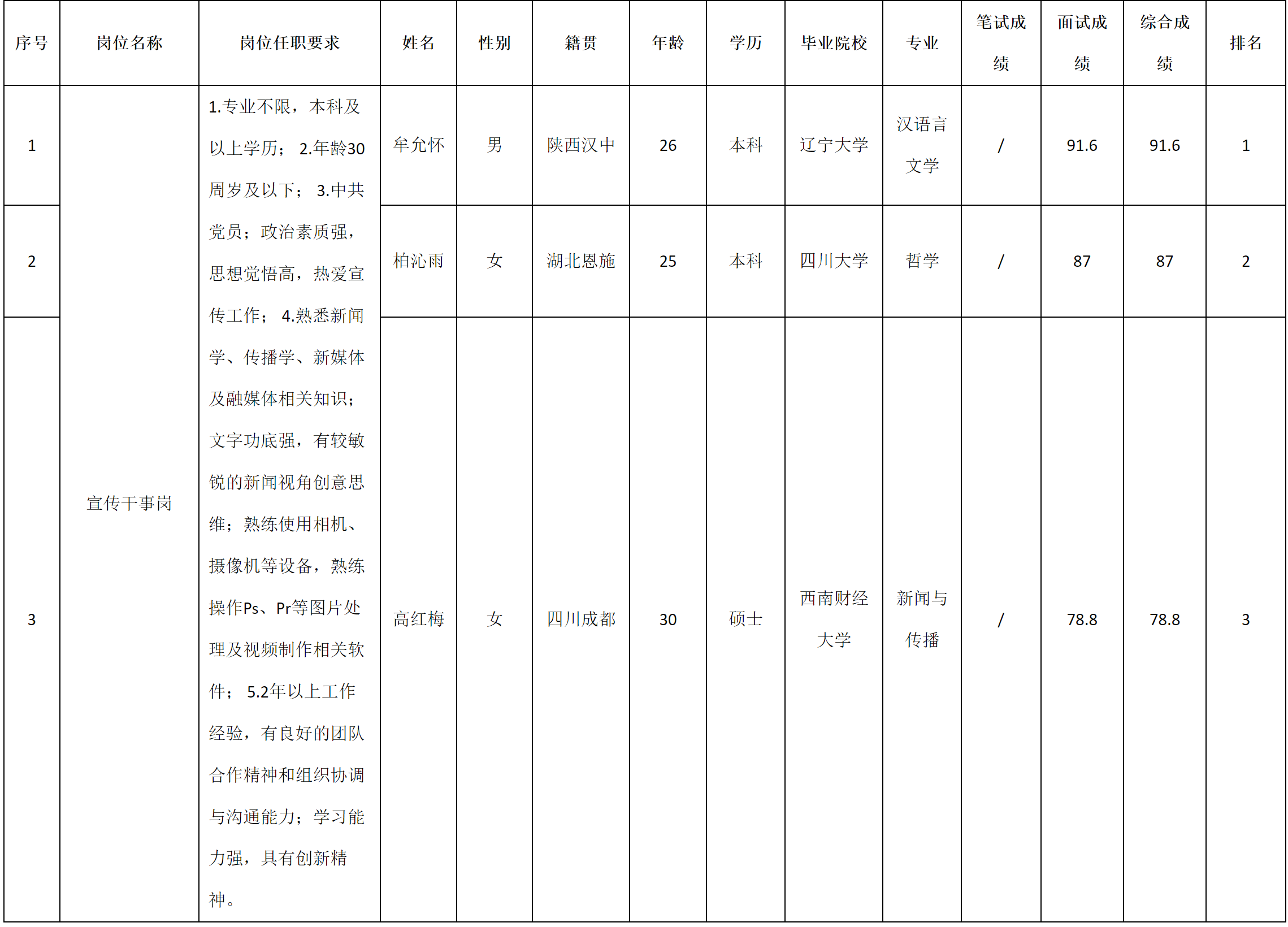 根據(jù)四川九州投資控股集團(tuán)有限公司發(fā)布的招聘公告及招聘相關(guān)規(guī)定,經(jīng)筆試、面試等程序,現(xiàn)將筆試(面試)成績(jī)予以公示。