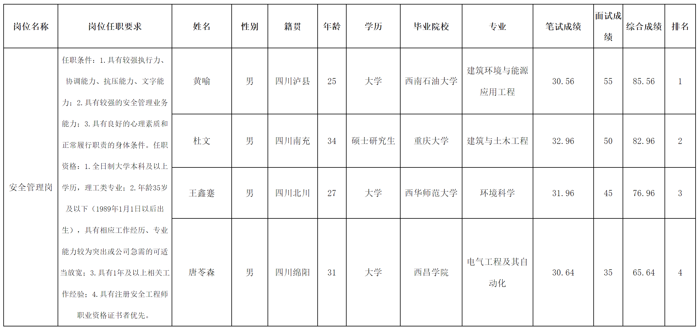 根據(jù)綿陽(yáng)燃?xì)饧瘓F(tuán)有限公司發(fā)布的招聘公告及招聘相關(guān)規(guī)定,經(jīng)筆試、面試等程序,現(xiàn)將綜合成績(jī)予以公示。