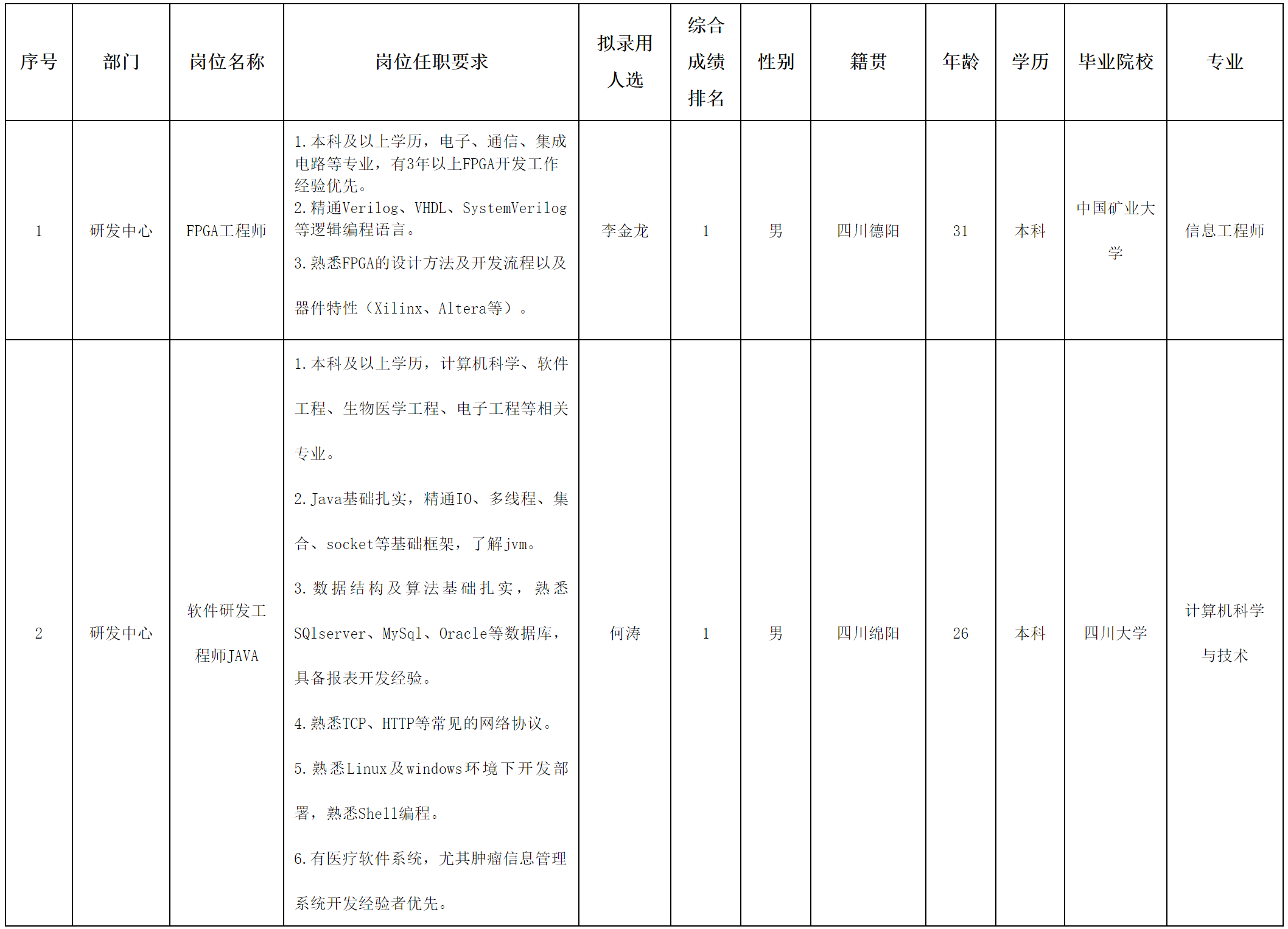 根據(jù)中玖閃光醫(yī)療科技有限公司發(fā)布的招聘公告及招聘相關(guān)規(guī)定,經(jīng)筆試、面試、考察、體檢等程序,擬錄用李金龍、何濤同志到中玖閃光醫(yī)療科技有限公司工作,現(xiàn)予以公示,具體情況如下: