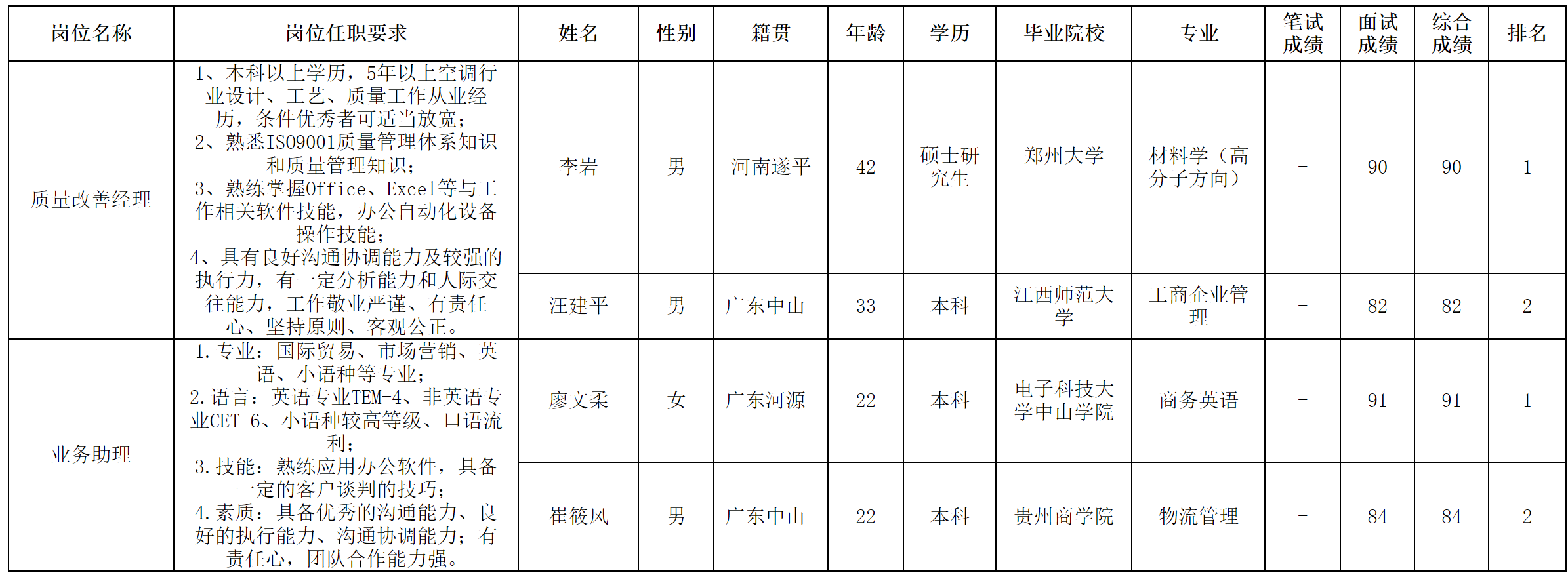 根據(jù)中山長虹電器有限公司發(fā)布的招聘公告及招聘相關(guān)規(guī)定,經(jīng)面試程序,現(xiàn)將面試成績予以公示。