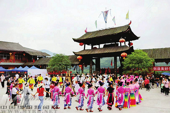 游客與羌族群眾一起跳沙朗(視覺(jué)綿陽(yáng) 周冀川 攝)
