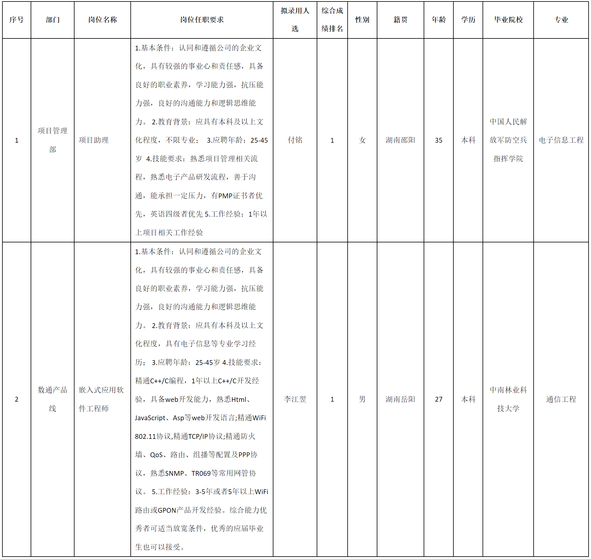 根據(jù)深圳市九州電器有限公司發(fā)布的招聘公告及招聘相關(guān)規(guī)定,經(jīng)筆試、面試、考察、體檢等程序,擬錄用李江翌,付銘同志到深圳市九州電器有限公司工作,現(xiàn)予以公示,具體情況如下: