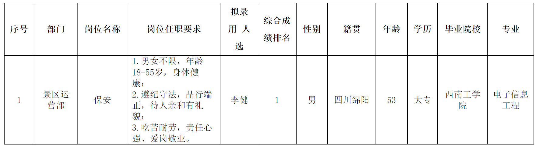 根據(jù)四川越王樓文化傳播有限公司發(fā)布的招聘公告及招聘相關規(guī)定,經(jīng)面試、體檢等程序,擬錄用李健同志到景區(qū)運營部工作,現(xiàn)予以公示,具體情況如下: