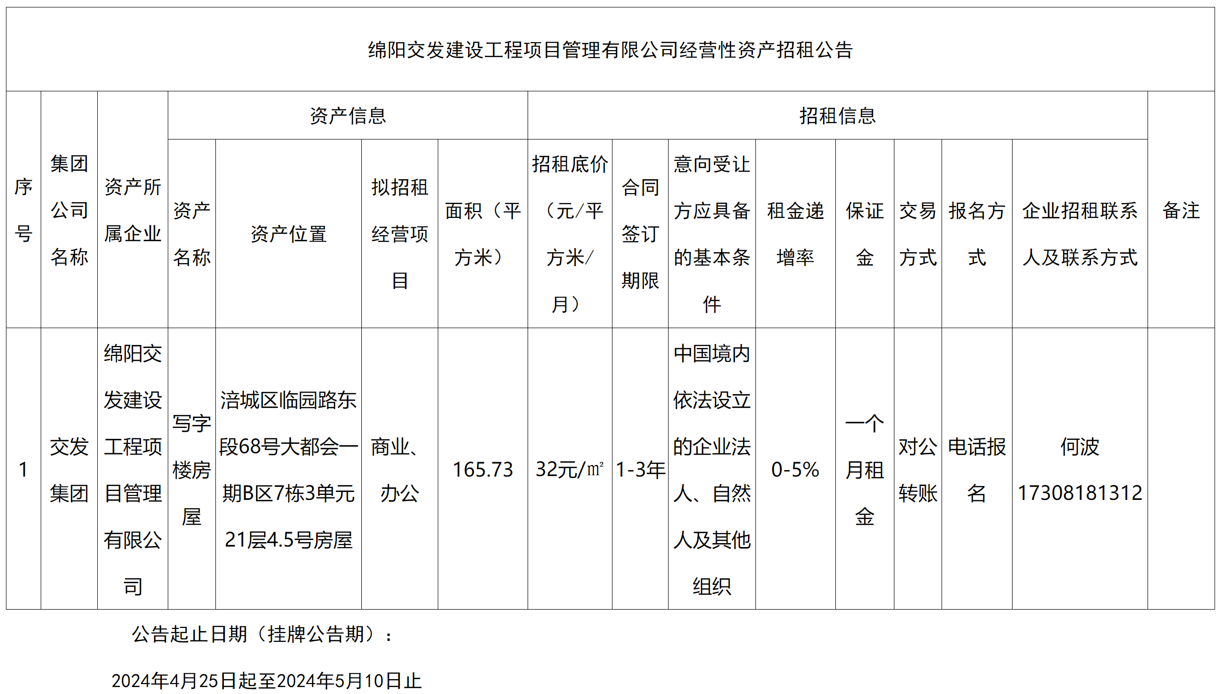 綿陽(yáng)交發(fā)建設(shè)工程項(xiàng)目管理有限公司經(jīng)營(yíng)性資產(chǎn)招租公告