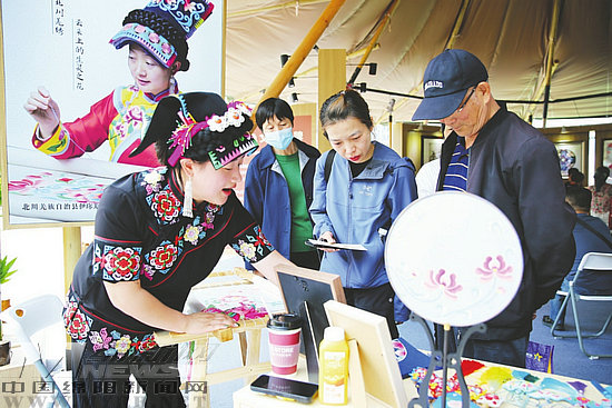 一邊是穿越時空的文物,另一邊是魅力十足的非遺。羌族草編、平武剪紙、綿州面塑、鑫田糧藝、北川羌繡等特色非遺項目,更是讓前來參觀的杭州市民目不暇接。