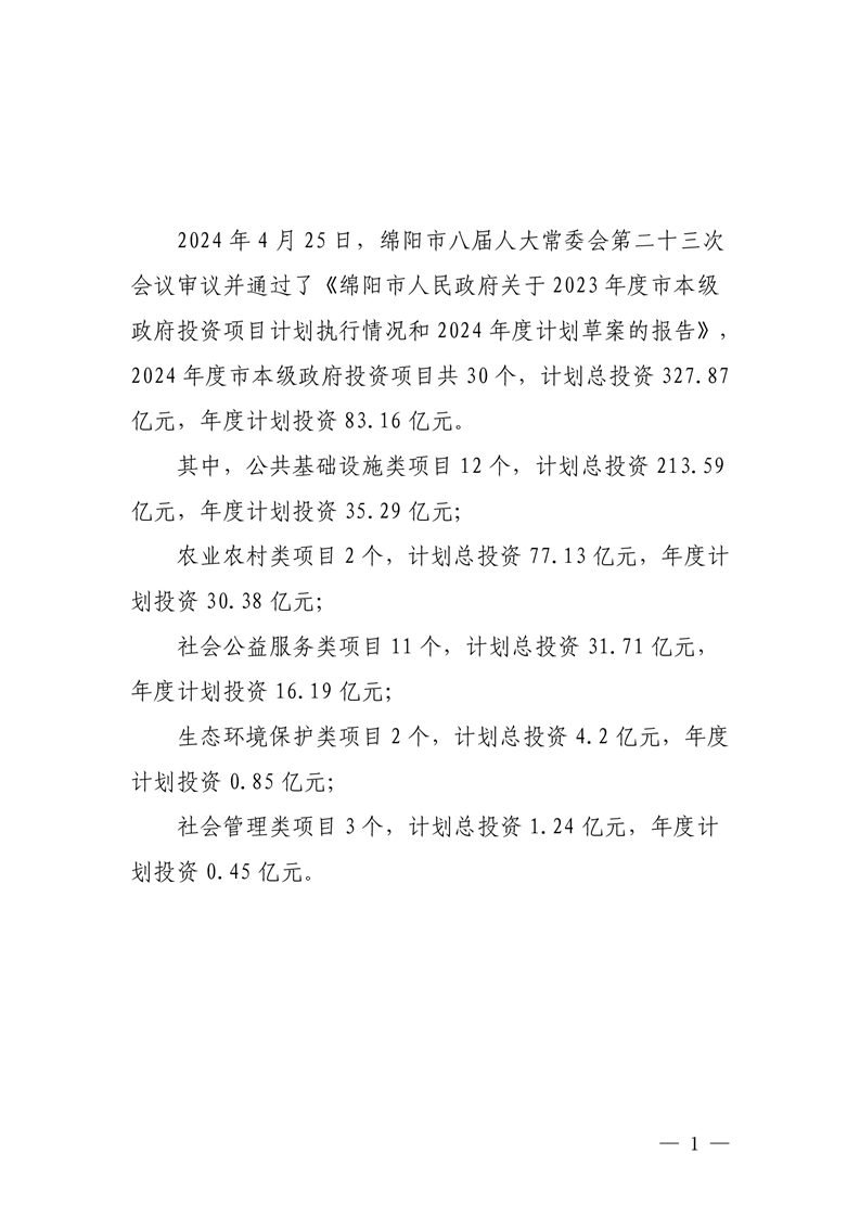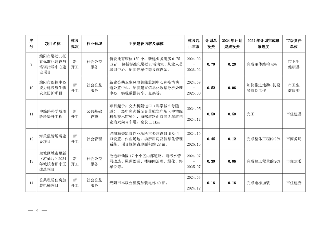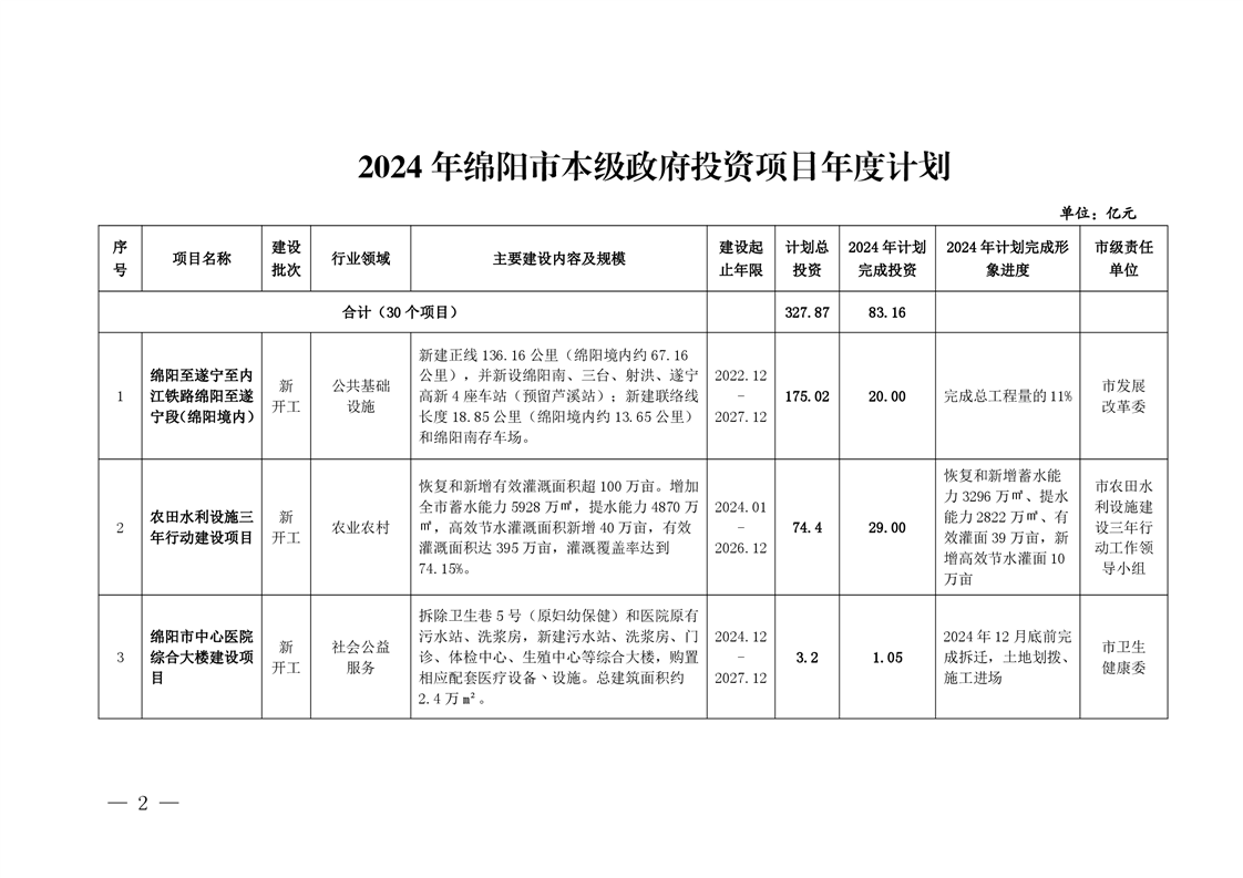 2024年綿陽市本級政府投資項目年度計劃